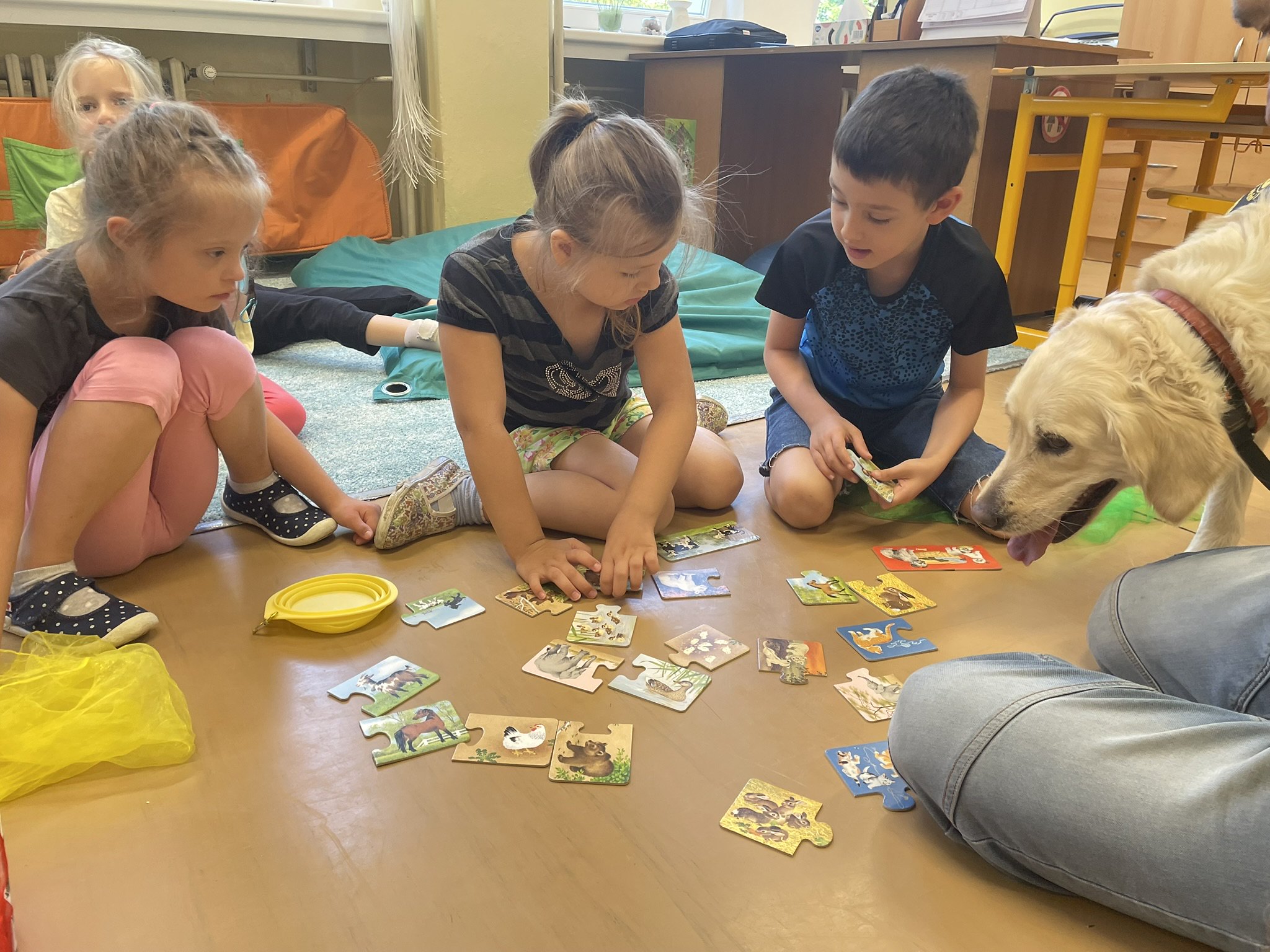 Děti mohou psa hladit, pomazlit se. Formou hry pes stimuluje děti k pohybu, rozvíjí se hrubá i jemná motorika – děti zkoušejí lézt po čtyřech jako pes, plazí se za psem, podlézají pod psem, hází míčky apod.